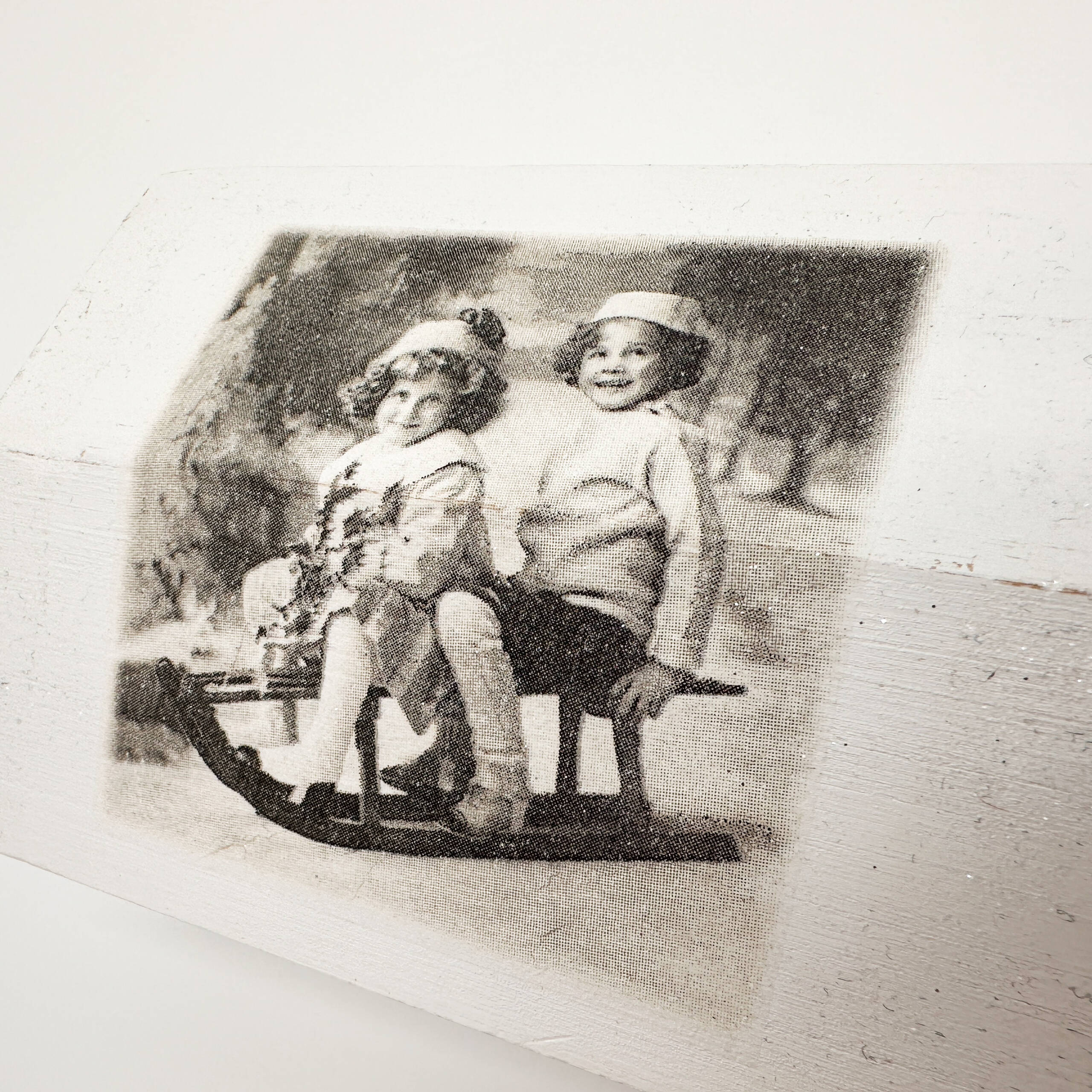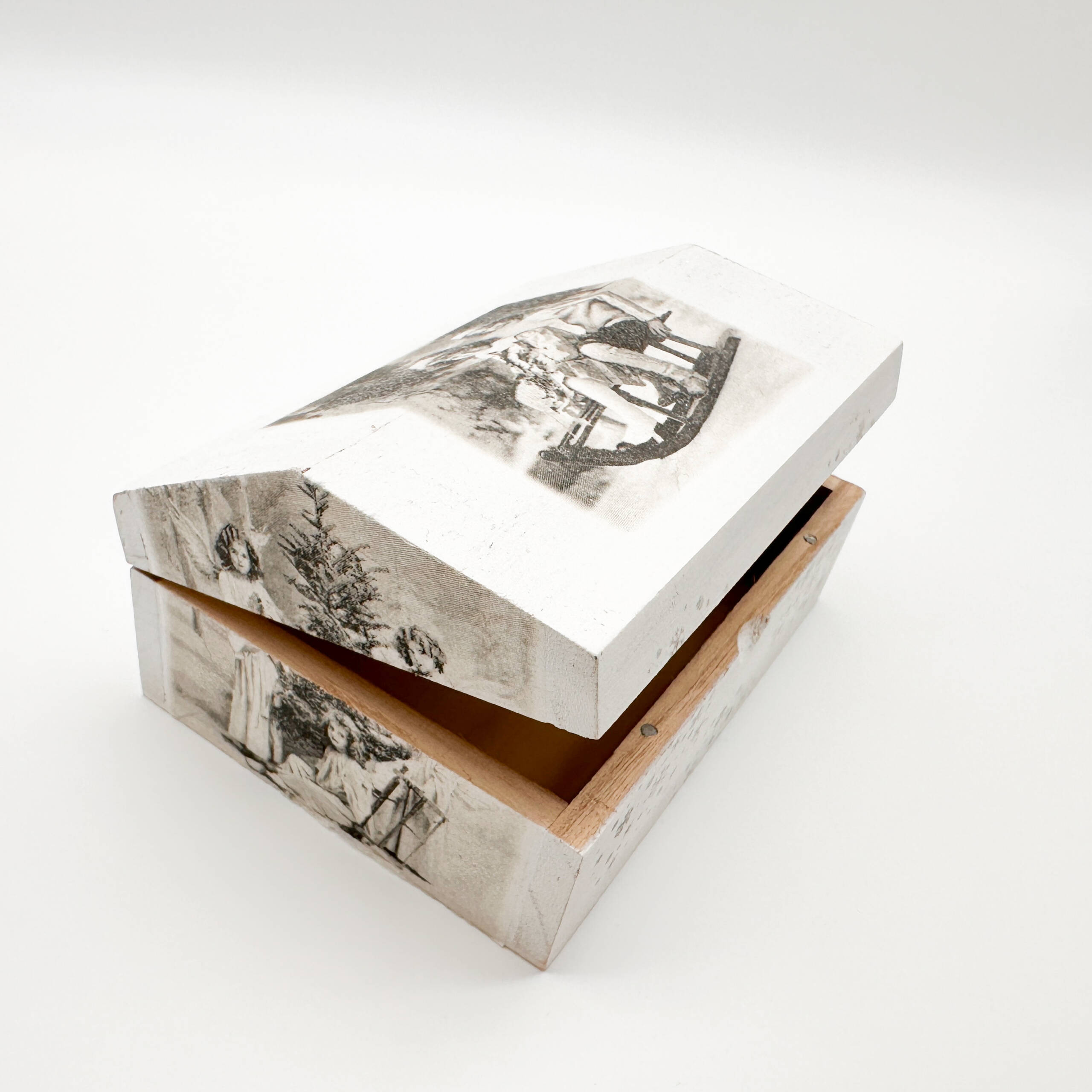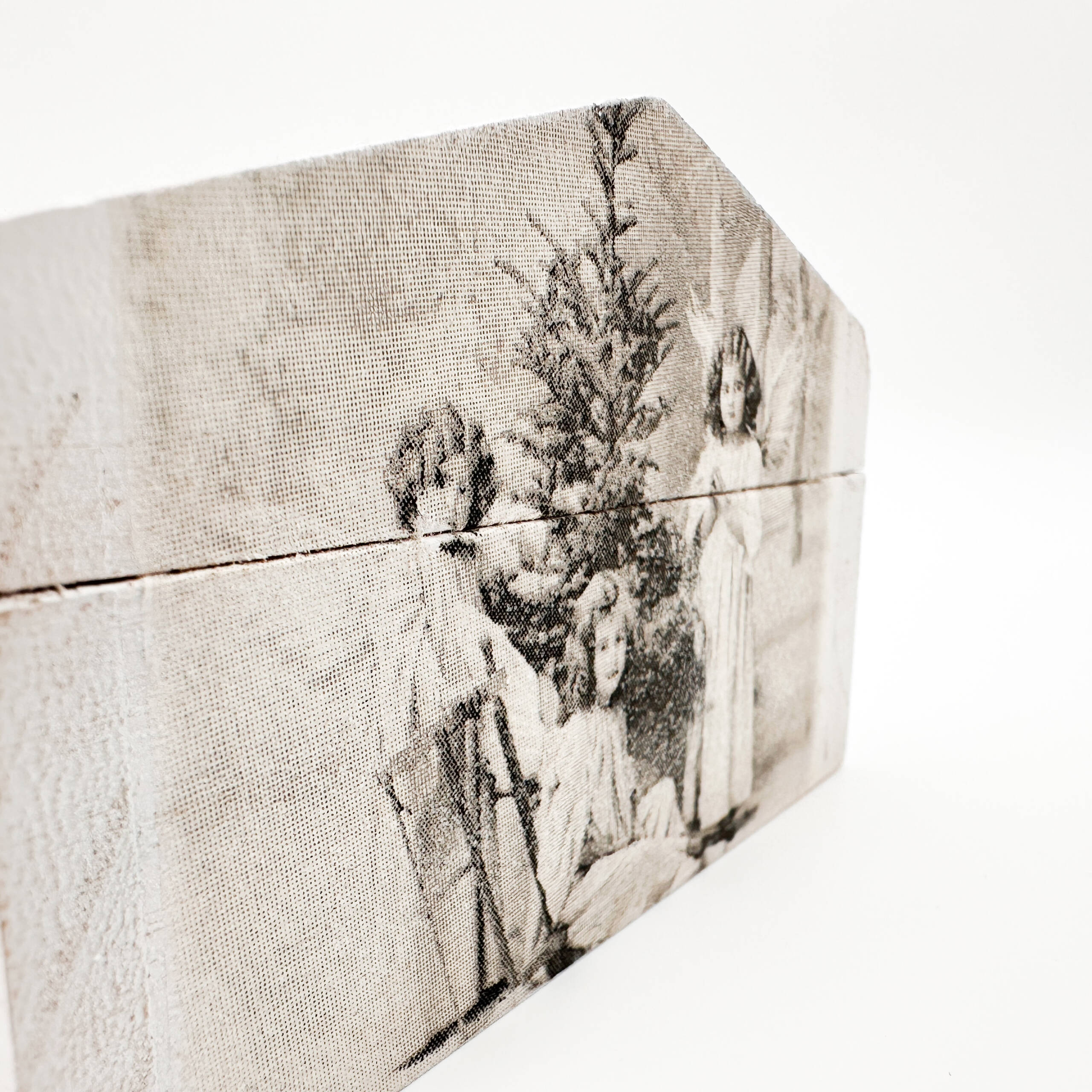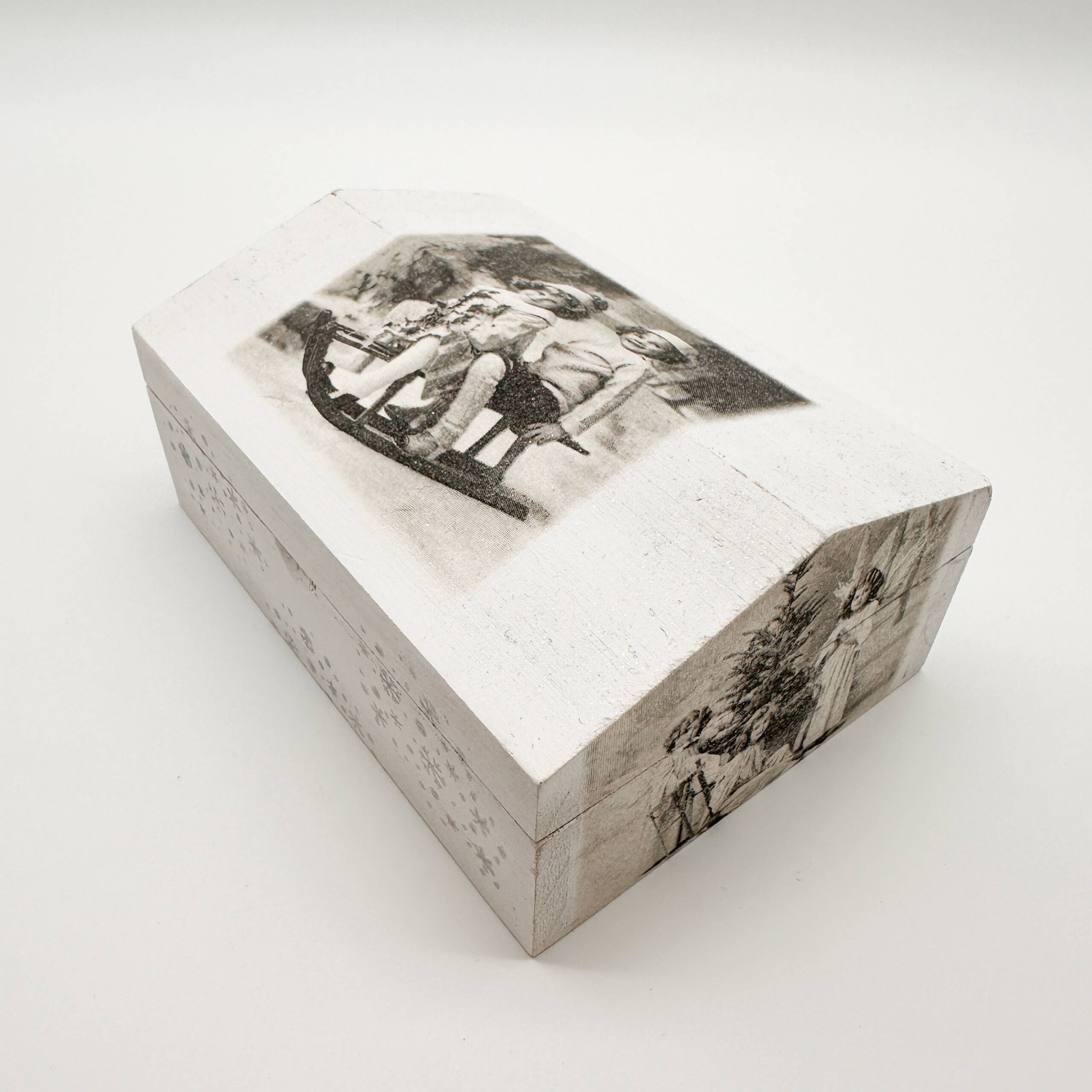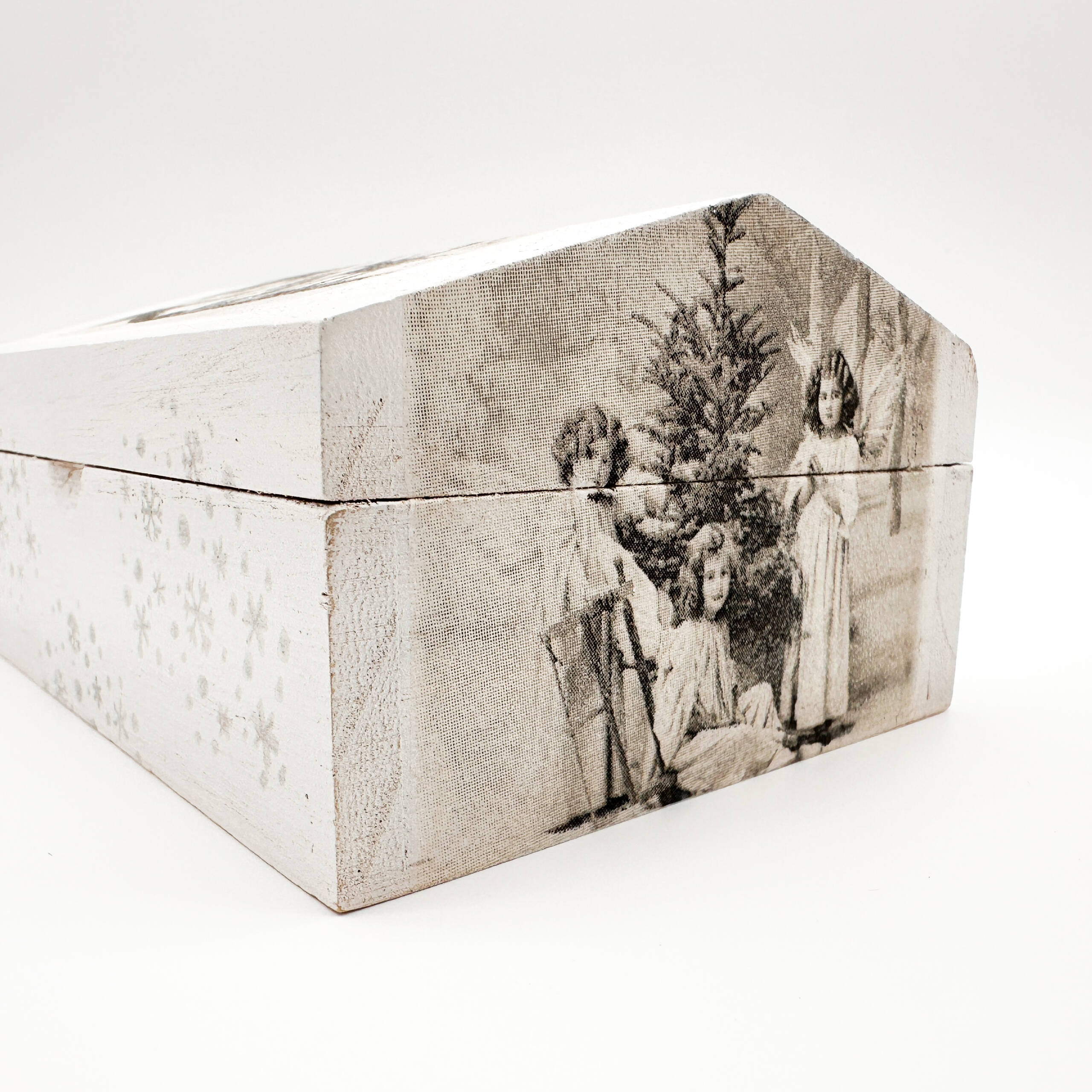 Diese liebevoll gestaltete kleine Holzbox verzaubert mit einem winterlichen Motiv aus Engeln und fröhlichen Winterkindern.