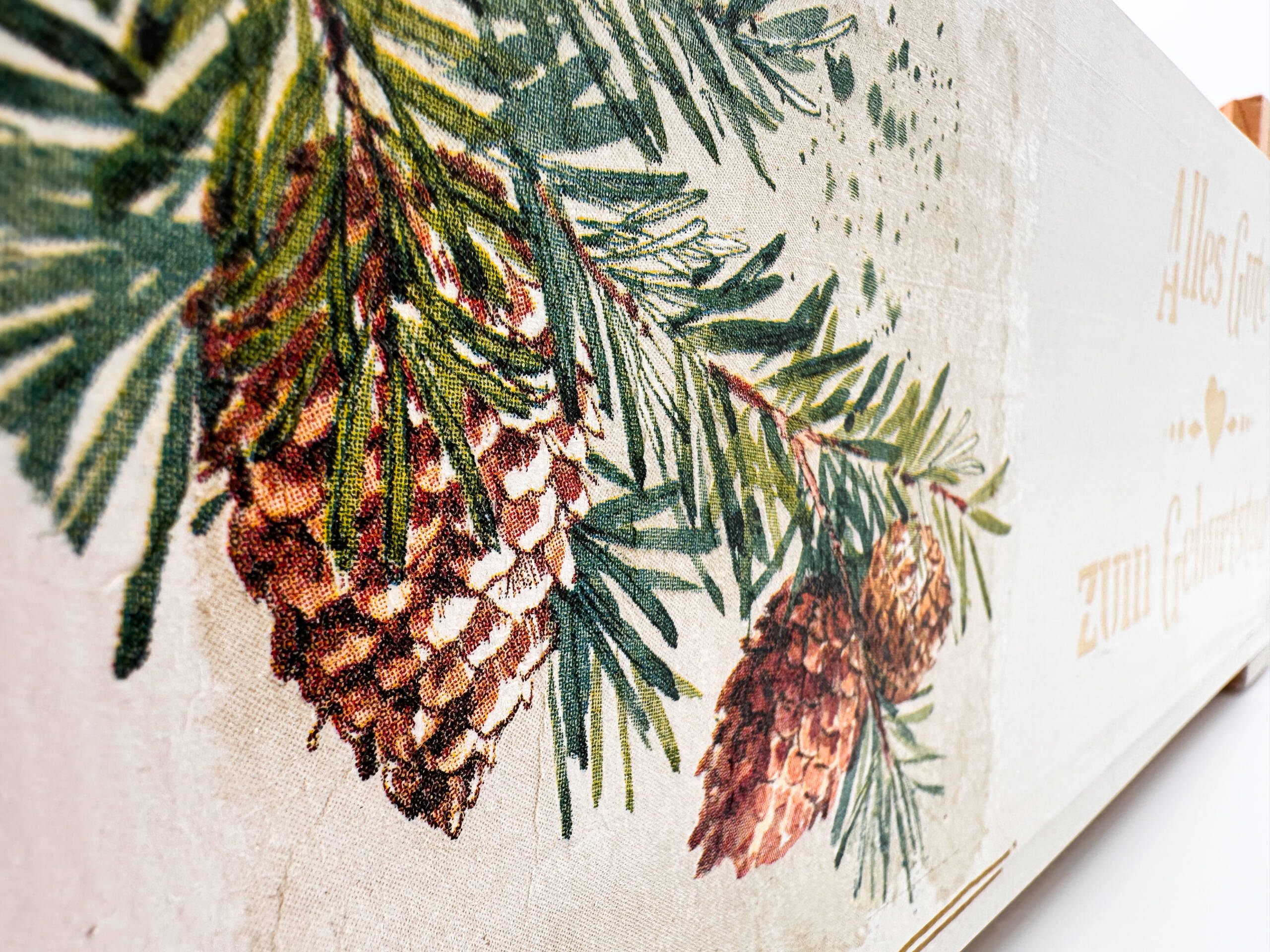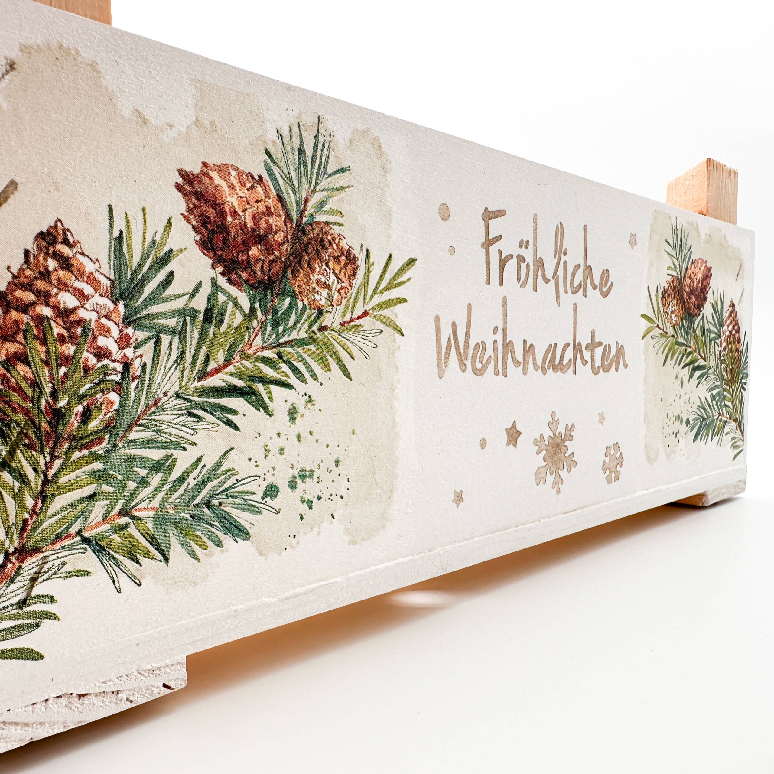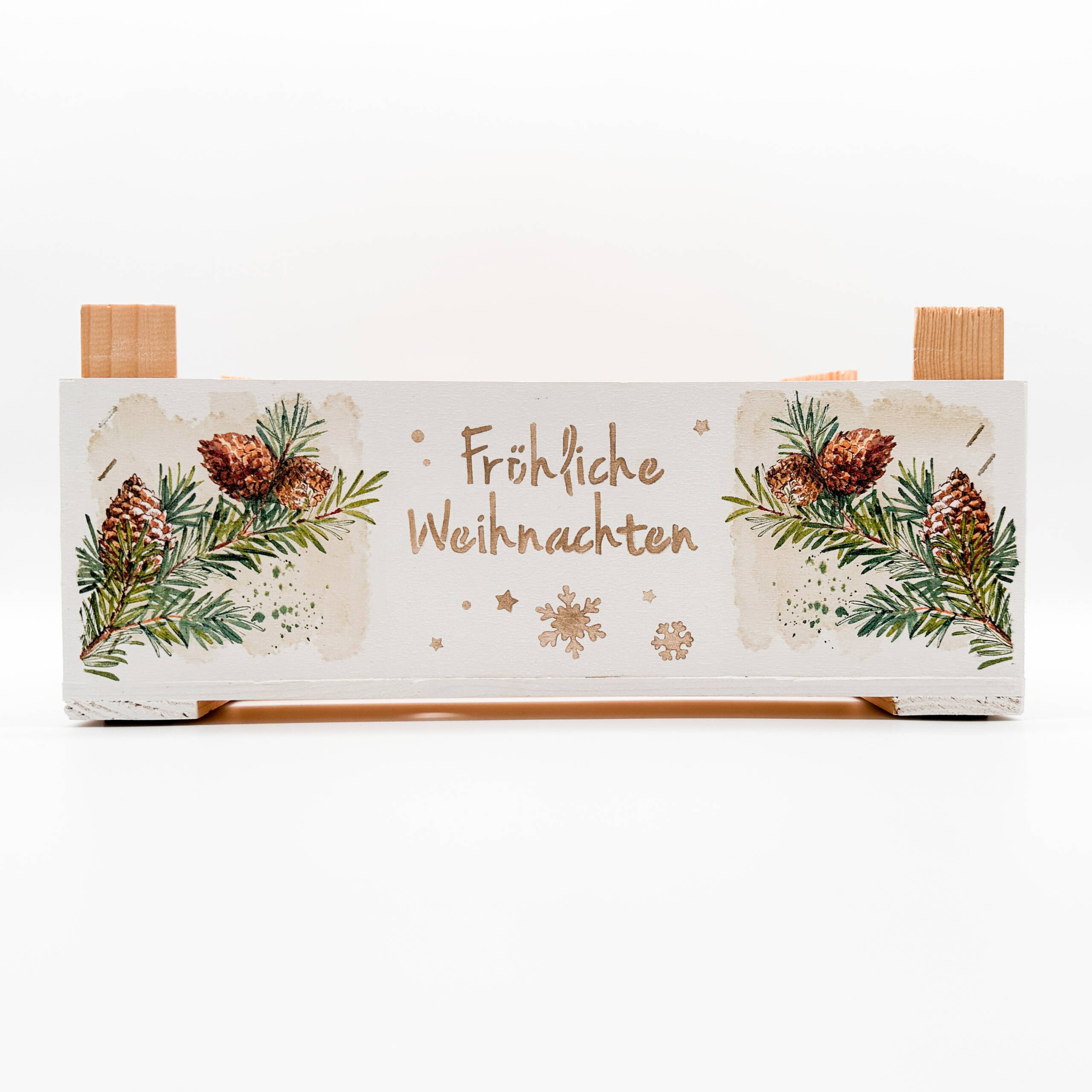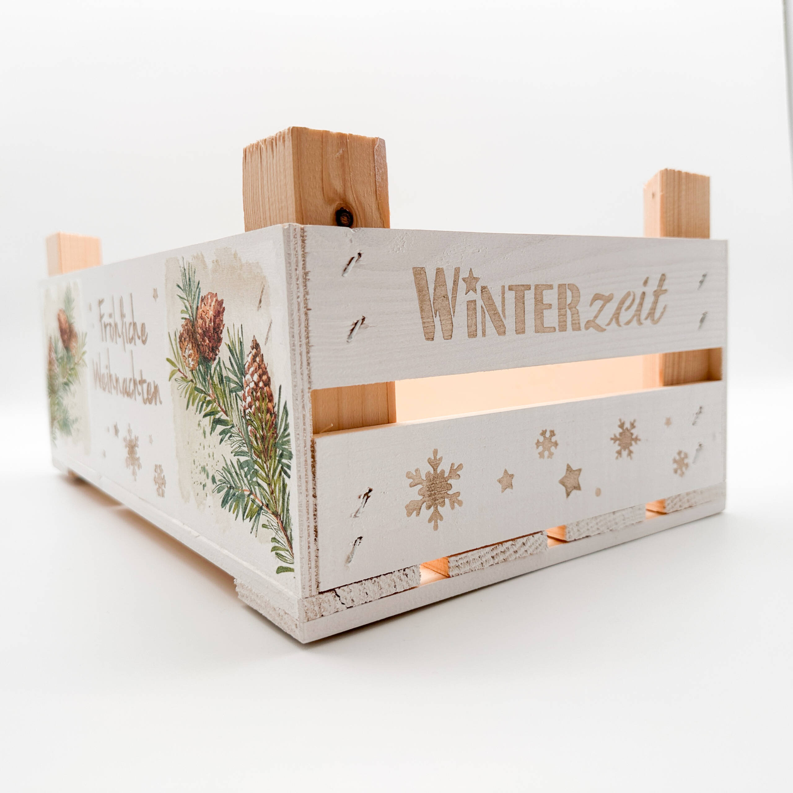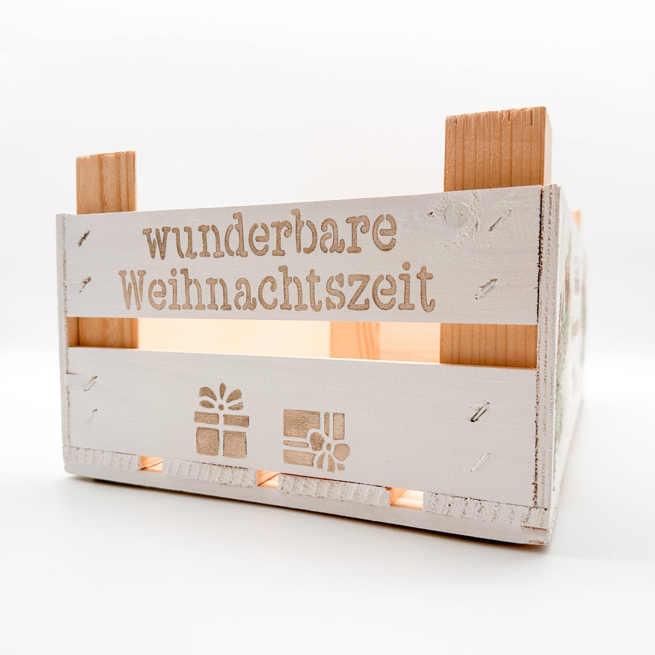 Weihnachtlich gestaltete Holzkiste zum Befüllen und Verschenken