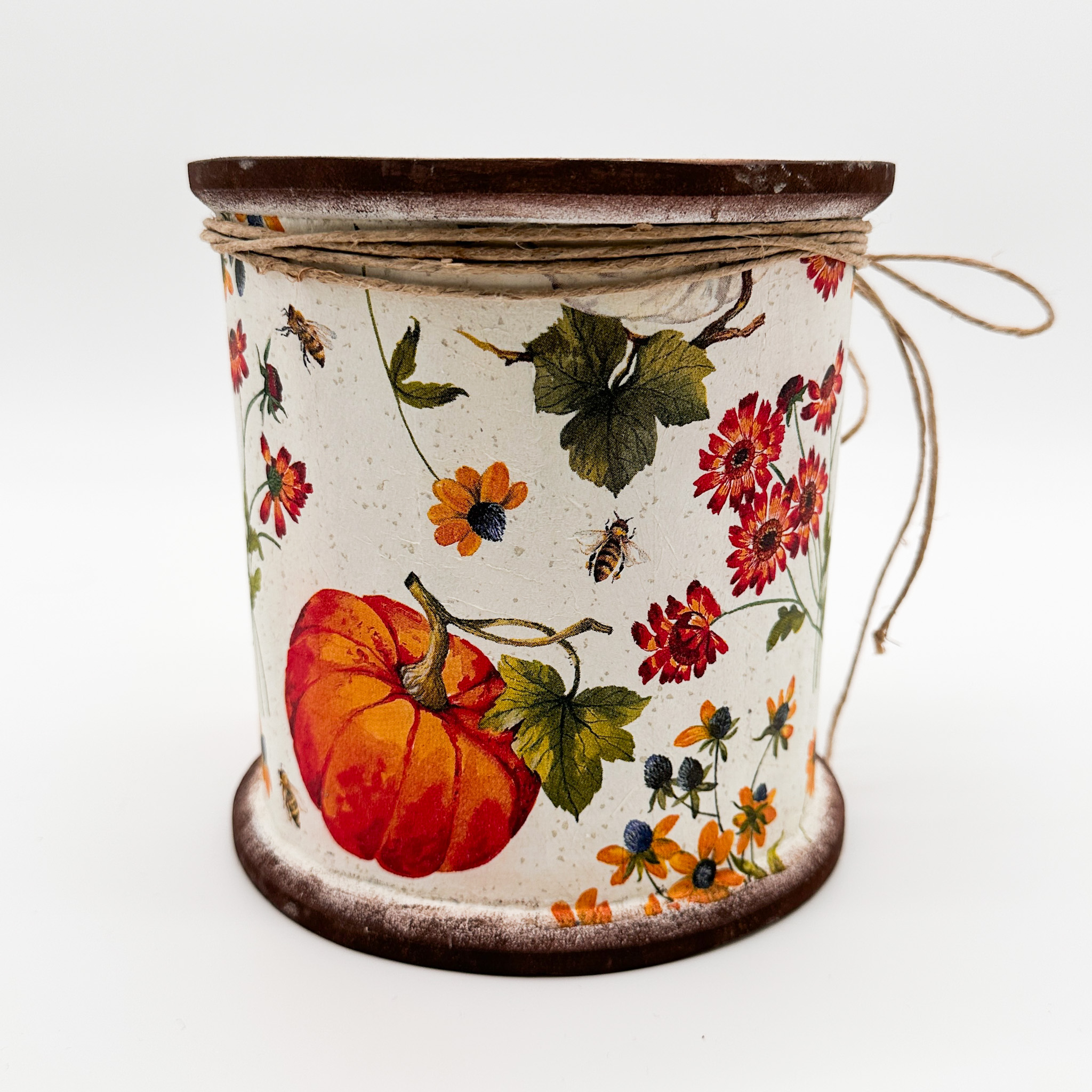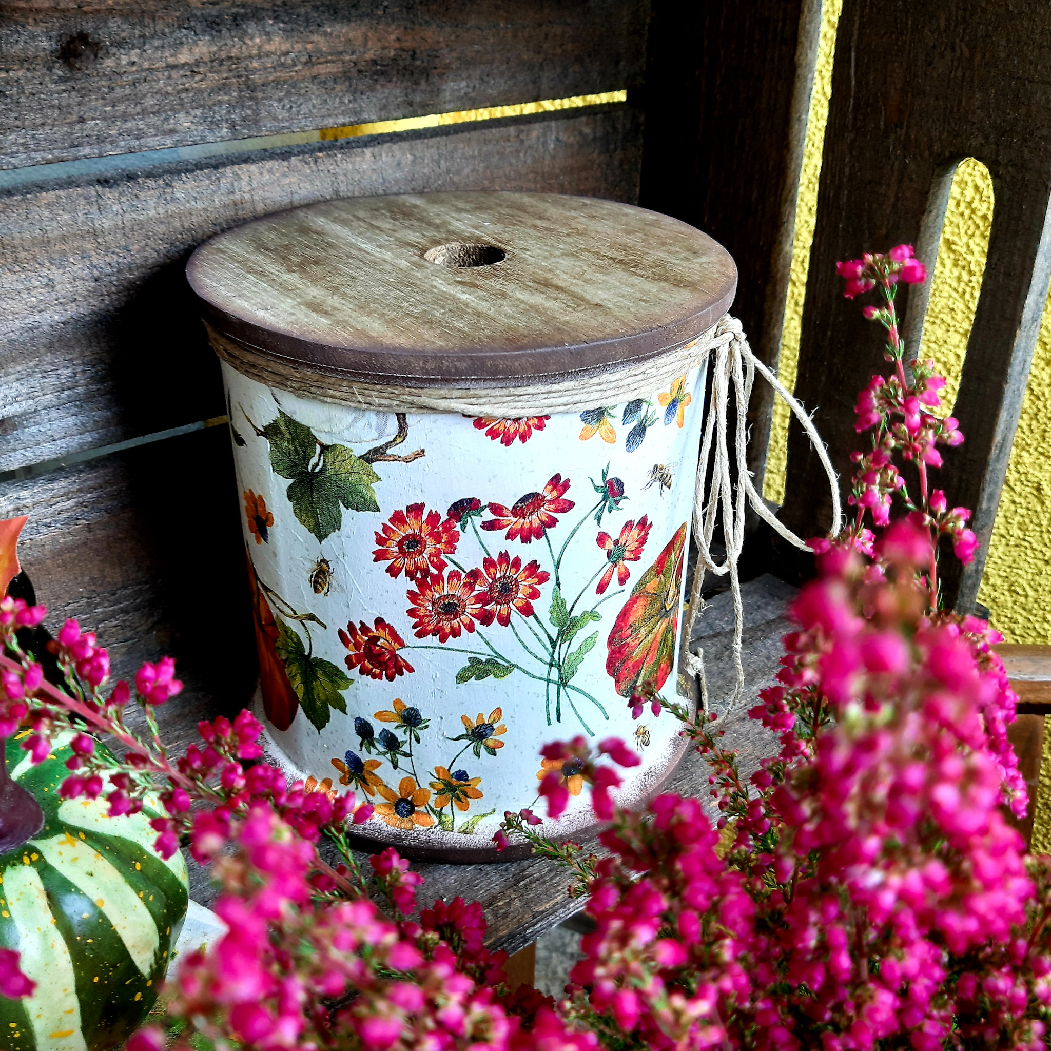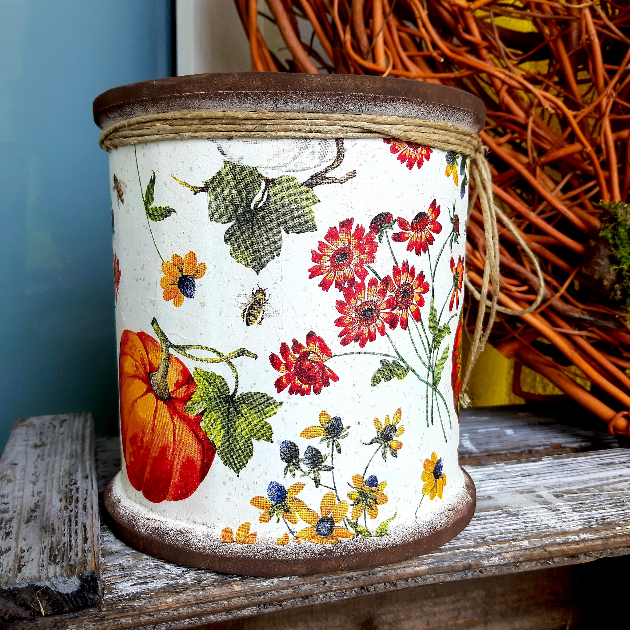 Diese liebevoll gestaltete Holzspule passt perfekt im Herbst als Deko für dein Zuhause.